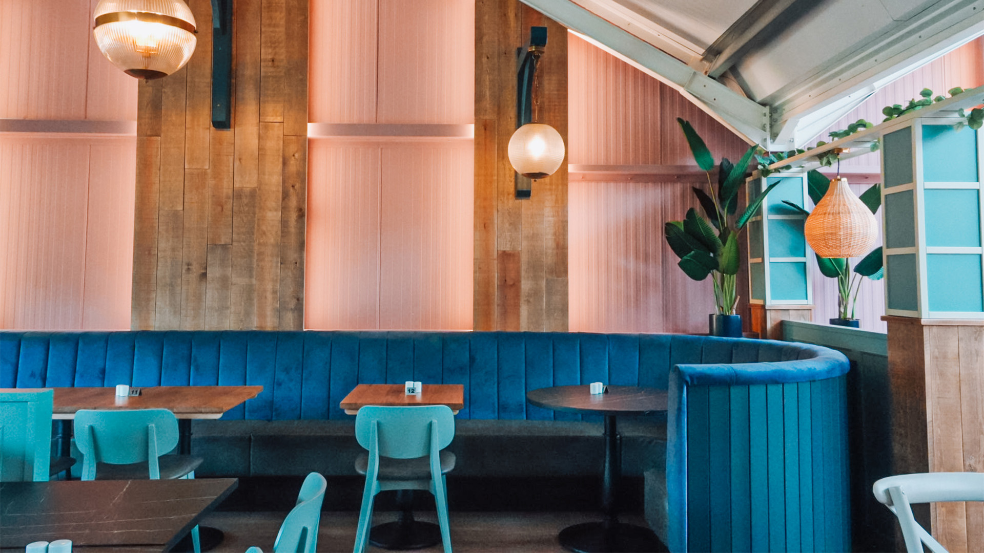 The design unfolds through floods of soft blue and pink hues that gently soften the pre-existing industrial edge, transforming the atmosphere into something light and inviting.
